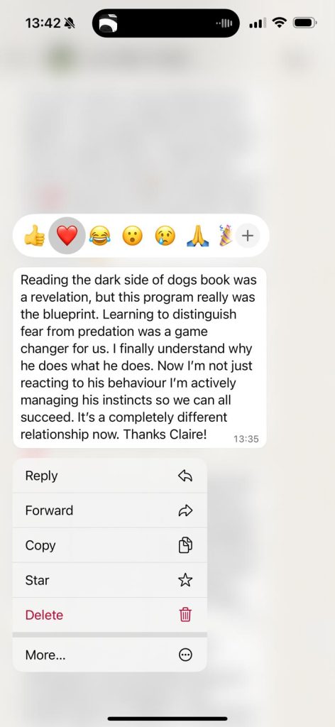 A 30-minute 1:1 assessment with Claire to review your dog’s patterns, environment and current challenges, so you’re not applying generic advice to a specific situation.